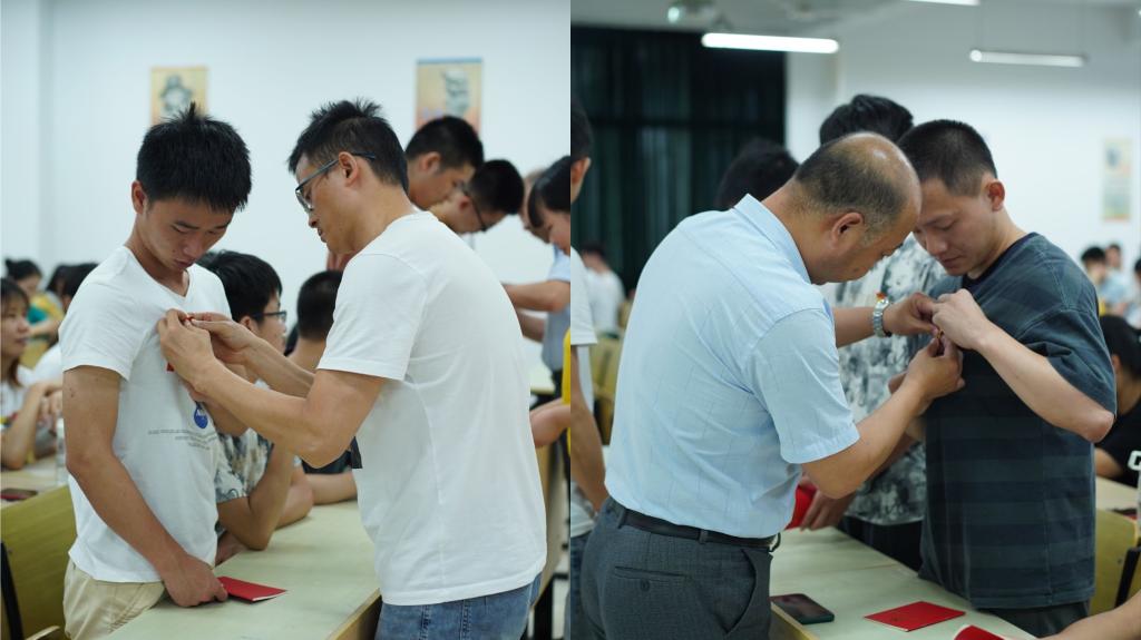 宣誓仪式在庄严的《国际歌》中拉开帷幕。张涛宣布本次新发展的预备党员名单,在学生党员代表李昕淼的领誓下,新发展的党员面向鲜艳的党旗,举起右手,庄严宣誓,表达对党的忠诚、为共产主义事业奋斗终生的决心。与会老党员与新党员一同宣誓,重温入党誓词。随后,郭宏、张涛以及各支部书记一一为新党员佩戴党员徽章。