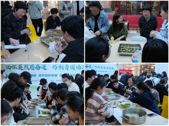 师生们欢聚一堂,共同体验了传统民俗文化活动——包青团。食堂工作人员向同学们展示了青团的制作工艺。同学们在后勤师傅的指导帮助下,撸起袖子,捻青、和粉、揉团、裹馅、搓圆,每一道工序都有模有样,大家共同配合,大小均匀的青团整齐摆入蒸笼,空气中弥漫着淡淡艾草清香。同学们一边品尝美味青团,一边进行清明诗词趣味问答,场面欢声笑语,充满着春天的气息。毛国红介绍了清明节吃青团的寓意,并强调,清明节是中国最重要的传统节日之一,有着丰富的文化底蕴,希望同学们守护好民族的传统文化记忆,守护好自己的文化家园。