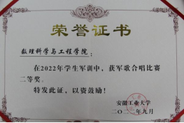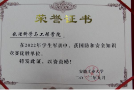 荣获军训优胜单位、队列考核优胜单位、内务卫生优胜单位、军歌合唱比赛二等奖、国防和安全知识竞赛优胜单位,学院2022级辅导员王婉琛被授予2022级学生军训工作优秀指导教师称号。