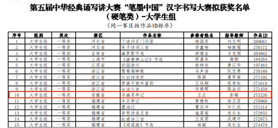 中华经典诵写讲大赛由教育部、国家语委主办,大赛以“书香新时代,‘典’亮新征程”为主题,通过诵读、书写、篆刻等语言文字表现形式,诠释中华优秀文化内涵、彰显中华语言文化魅力、弘扬中国精神。第五届中华经典诵写讲大赛“笔墨中国”汉字书写大赛已完成全部赛程,共评选出大学生组硬笔书法一等奖作品32幅,其中安徽赛区仅有王正同学获一等奖。下一步,学院将进一步学习贯彻习近平文化思想,引导师生继承和弘扬中华优秀传统文化,厚植爱国主义精神,坚定文化自信自强。(撰稿:张佳良 审核:陈恳 张敏)